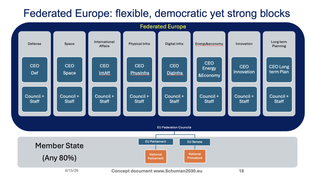 On federalism and its variants How can we define “federalism”, “confederalism”, “bounded federalism” and “multi-federalism”? These terms are often used loosely in political discourse, but they have distinct meanings in constitutional theory and practice. Let us define each precisely, then show how they relate to the Schuman2030 proposal. The verdict: Schuman2030 concept advocates for a “Bounded Multi-Federal Europe”. Below a schematic diagram. The new Europe applies a “bottom-up” subsidiarity audit and creates for each supra-national competence domain a Federal Council to which nations can become a member. The unanimity rule is replaced by a general rule to reach 80% consensus for all decisions. For more details see WP6 below. Continue reading on www.Schuman2030.eu More details in the WP6 Working Paper |